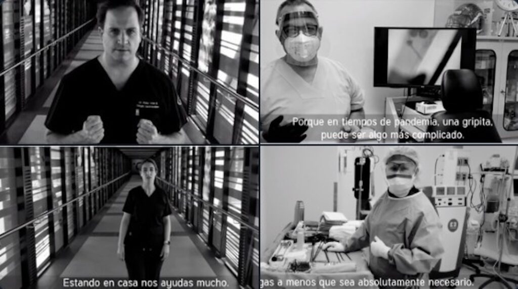 «Aquí estamos -en los hospitales- incluso sabiendo que más del 13 por ciento de los contagios por coronavirus es personal médico», se escucha en el video.